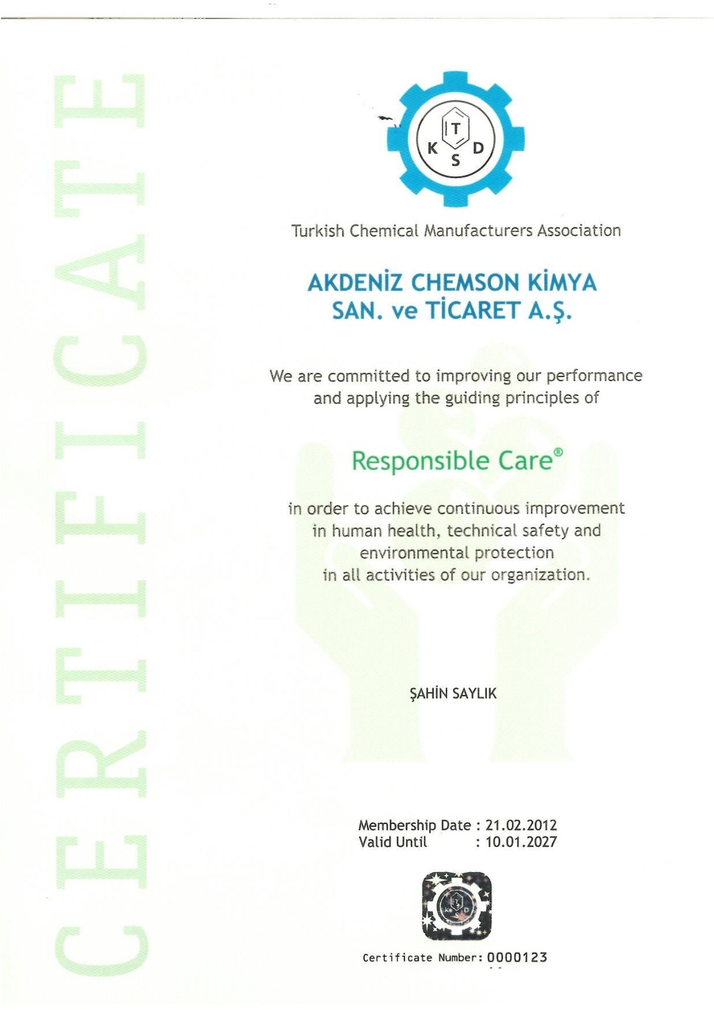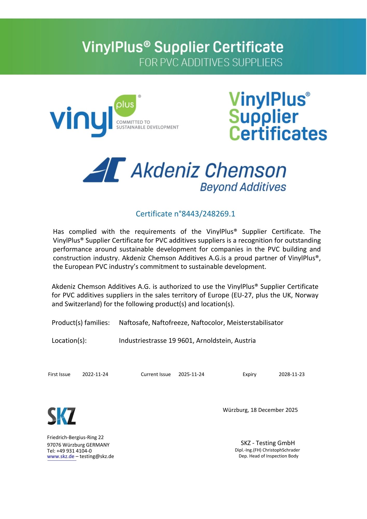 Akdeniz Chemson VinylPlus Membership Certificate