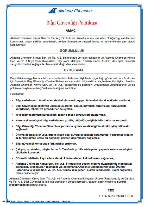Política de Segurança da Informação Akdeniz Chemson Kimya
